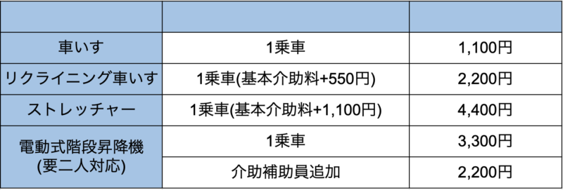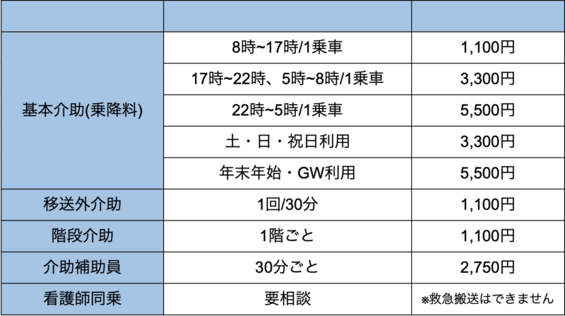 ※乗降介助とは福祉車両のスロープやリフトを使ってご利用者が車いすのまま乗り降りできる介助のことです。ご自身で乗降できる場合は「-1,100円」となり、時間内の利用の場合はかかりません。(土日祝などの時間外は記載料金-1,100円となる)